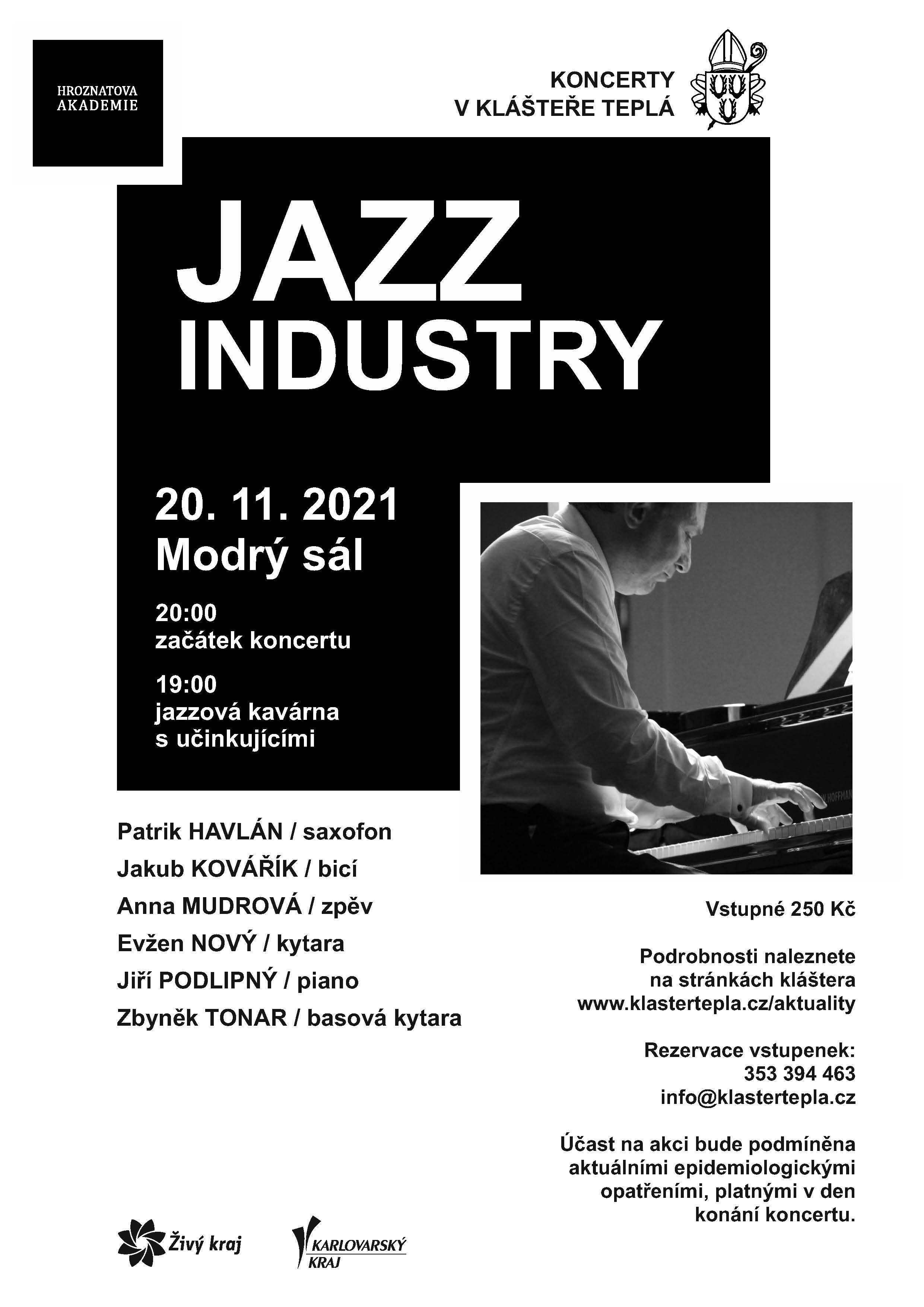 Hroznatova akademie vás 20. 11. 2021 od 19.00 hodin zve do modrého sálu tepelského kláštera na jazzový koncert JAZZ INDUSTRY – letošním rokem také s jazzovou kavárnou s účinkujícími!